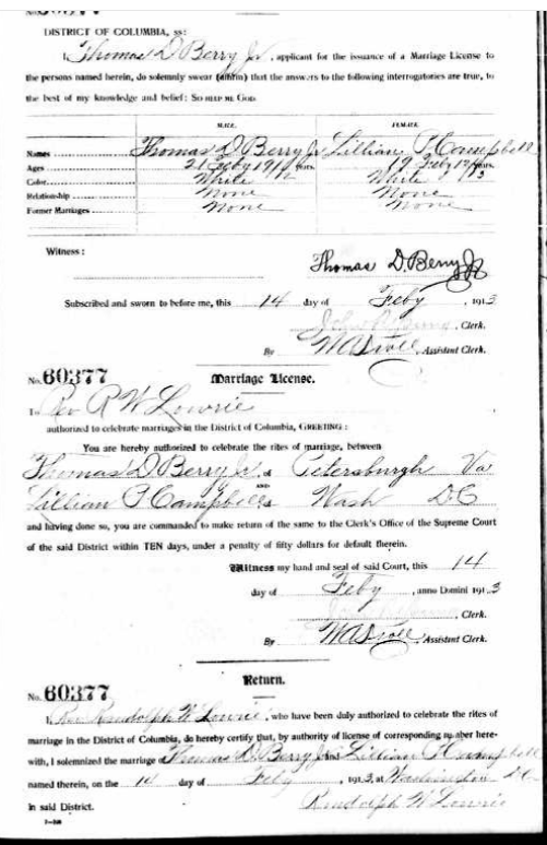 Scanned copy of the wedding register showing Thomas D. Berry, Jr.’s and Lillian P. Campbell’s license dated Feb. 14, 1913. Note they gave her age as 19, though she was only 18. Ancestry.com.