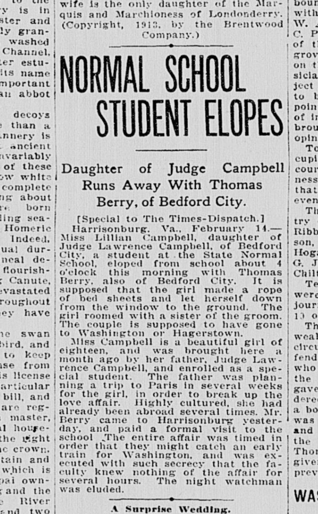Young Lillian, described as a “beautiful blonde,” grew up in Bedford, Virginia, where she fell in love with a young man her father disliked. Her father, J. Lawrence Campbell, was a prominent lawyer, former state senator, and judge of the circuit court for Bedford and Franklin counties. Her beau, Thomas Davis Berry, came from an affluent family, too: his father, and uncle, and grandfather were all in tobacco. After his parents died in 1907 and 1909, however, Tom and his siblings were divided among various relatives. Perhaps Lillian’s doting father, a widower, doubted Tom’s prospects. When the couple got engaged, the Judge took more aggressive measures to break them up. He enrolled her as a special student at the Normal school in Harrisonburg in January 1913 at the start of the spring quarter. But her enrollment was temporary for he also promised to take the 18 year old to “Paris in April for study and travel.” Clearly, he was buying time, hoping that separation would change Lillian’s mind.1