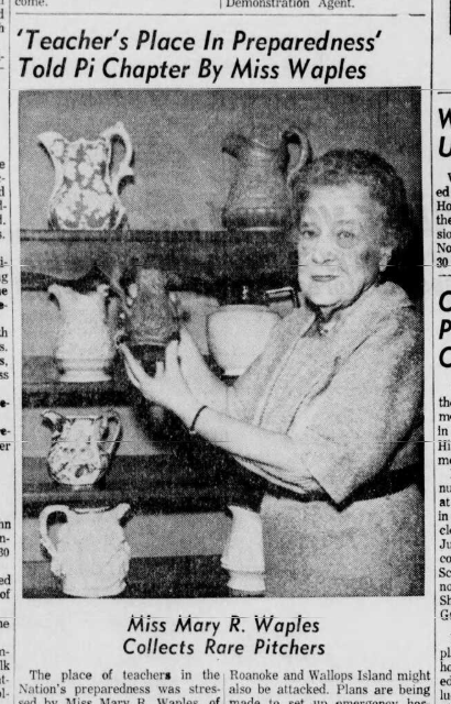 Clipping from DNR, Nov. 17, 1961. Still active as a Red Cross volunteer, Waples gave a public lecture in a local banquet room on the need for civilian preparedness in the event of a coastal attack on the United States by Cuba. Note the photo highlights her domesticity, posing her in front of her “rare pitchers” carefully displayed at home.