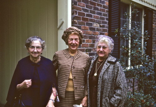 A 1968 photo of Varner, center, with her trademark red hair, hat, and fashionable suit in shades of brown, flanked by her friend Countess Mitchum Hurd, left, and another woman. Photo from Ancestry.com.