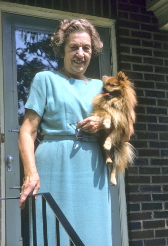 Bernice Varner ca1981 on the steps of her home, holding a small dog.